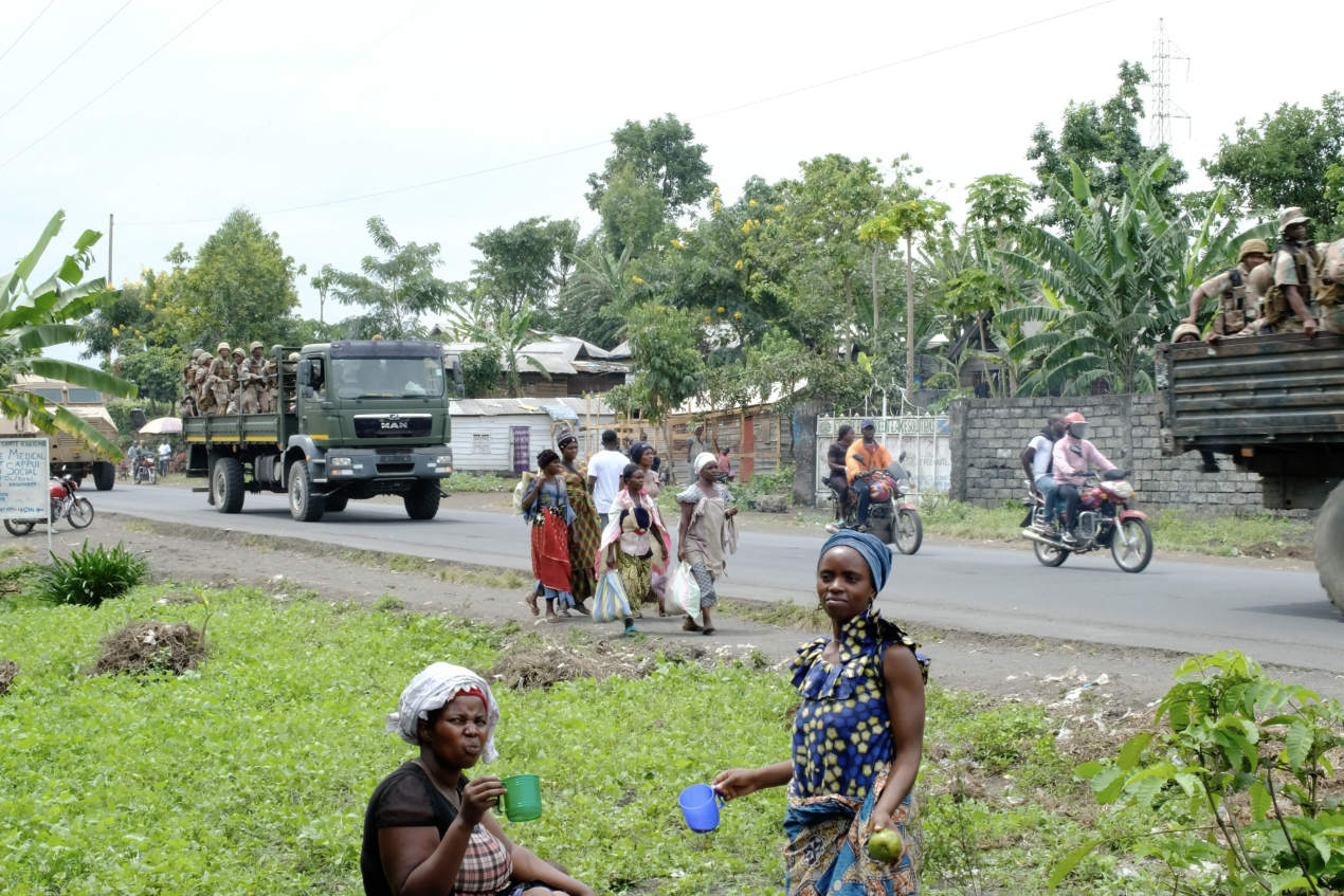 Troepen van de de Ontwikkelingsgemeenschap van Zuidelijk Afrika (SADC) rijden weg van Goma, richting Sake.