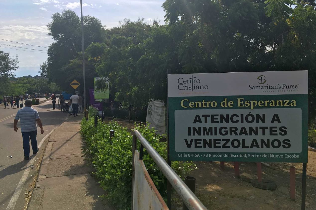Een bord van een ngo in Colombia maakt Venezolaanse vluchtelingen erop attent dat ze hier hulp kunnen krijgen. Maar de steun van de gastlanden zelf neemt steeds meer af.