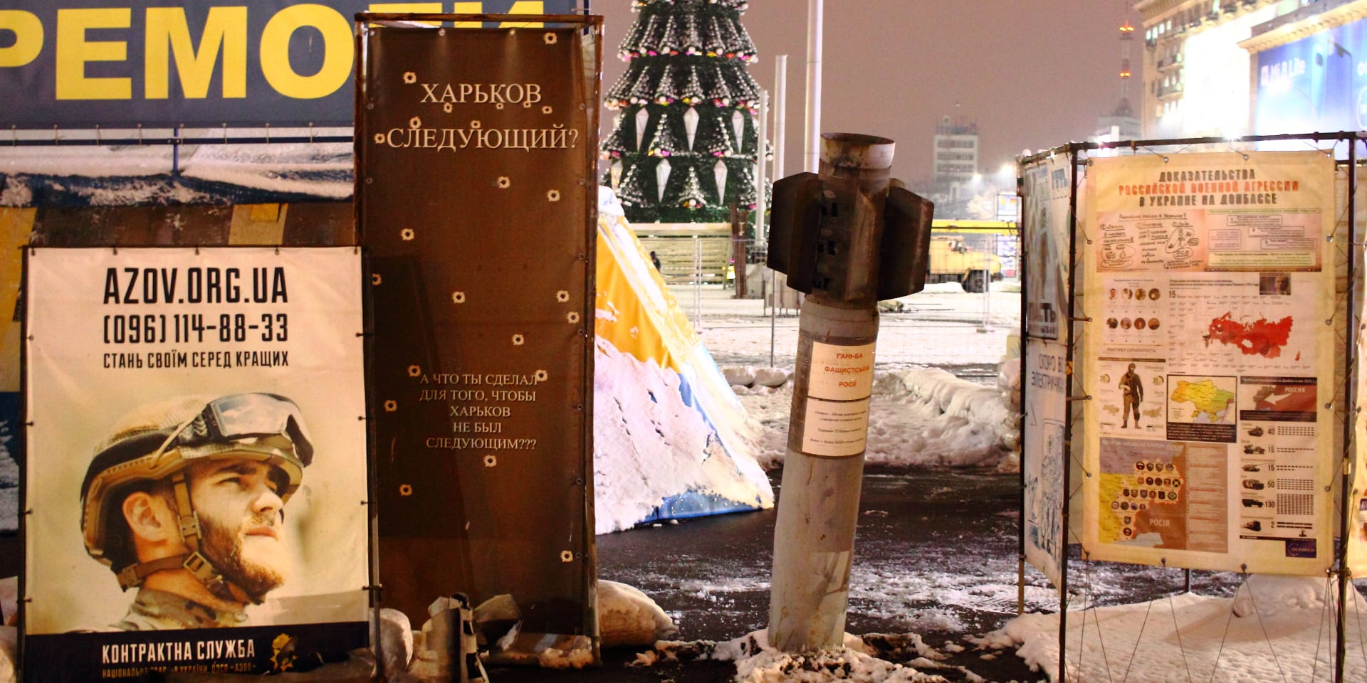 Dat lijkt onwaarschijnlijk na de Euromaidan-opstand waarin demonstranten uitkeken naar een Oekraïne als democratische rechtsstaat. Maar loop eens langs de hoofdingang van Kharkiv’s reusachtige Vrijheidsplein en zie dat niemand vreemd opkijkt van een legertent dat daar geplaatst is met bom, zandzakken, propagandamateriaal en een wervingsaffiche met een sympathiek ogende militair en het internetadres van Azov erboven.