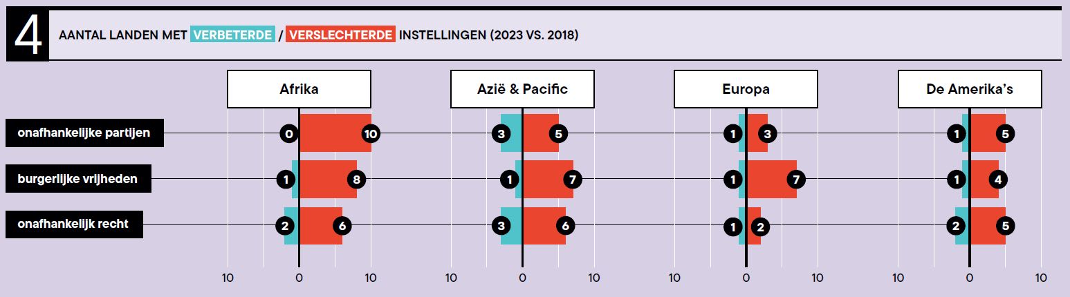 De instellingen die de macht van verkozen bestuurders beperken, en het ‘liberale’ van de liberale democratie beschermen, staan nog meer onder druk. Volgens International IDEA gaat het er sinds 2017 op achteruit met parlementen die verkozenen controleren, onafhankelijke rechters die over de naleving van de wet waken, een vrije pers, een sterke bureaucratie en burgerrechten die minderheden beschermen (figuur 2), en dan vooral in Afrika en Azië (figuur 4).