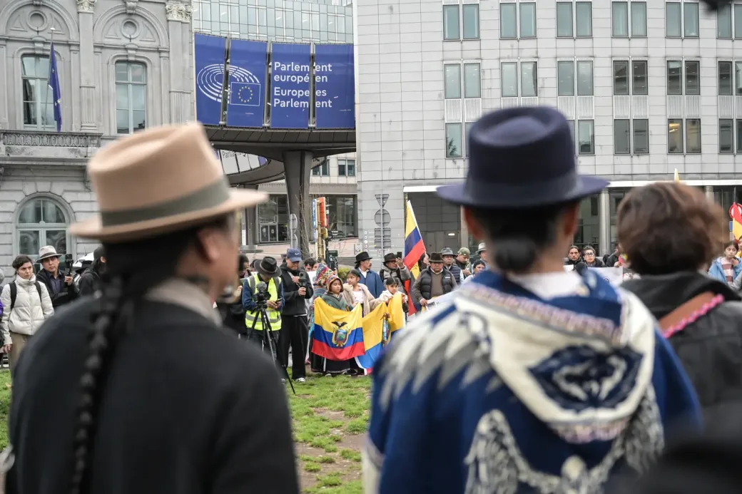 Een groep van voornamelijk Otavalo’s, maar ook Ecuadoranen uit Guayaquil, Quito en andere plaatsen, komen samen voor het Europees Parlement in Brussel.