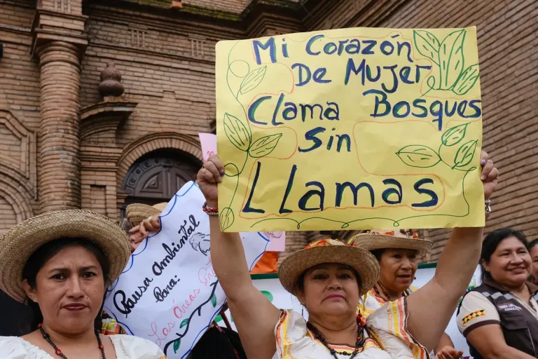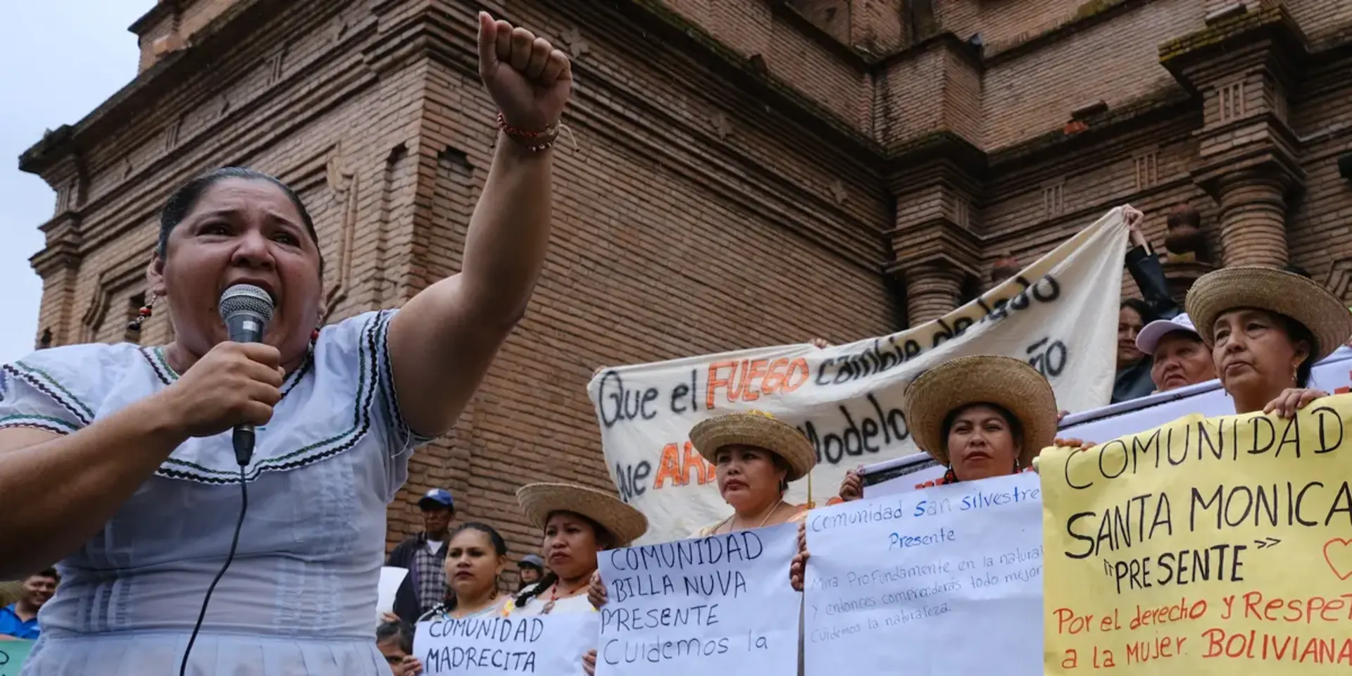 Actievoerders klagen de bosbranden in Bolivia aan in oktober 2024.