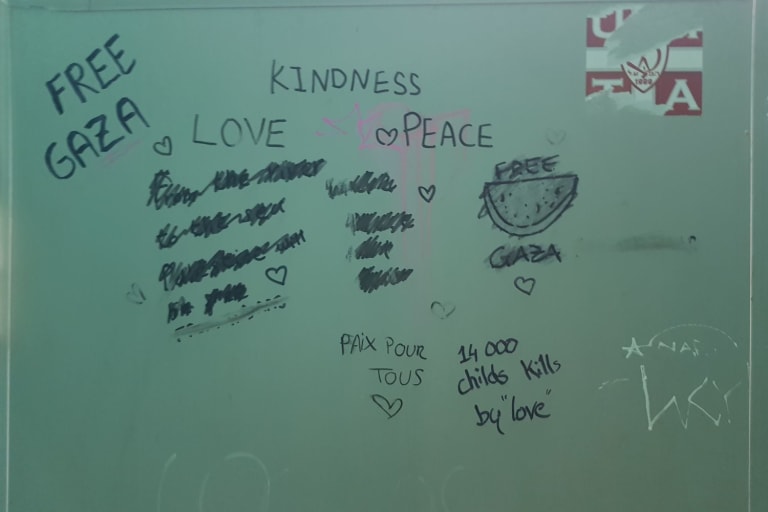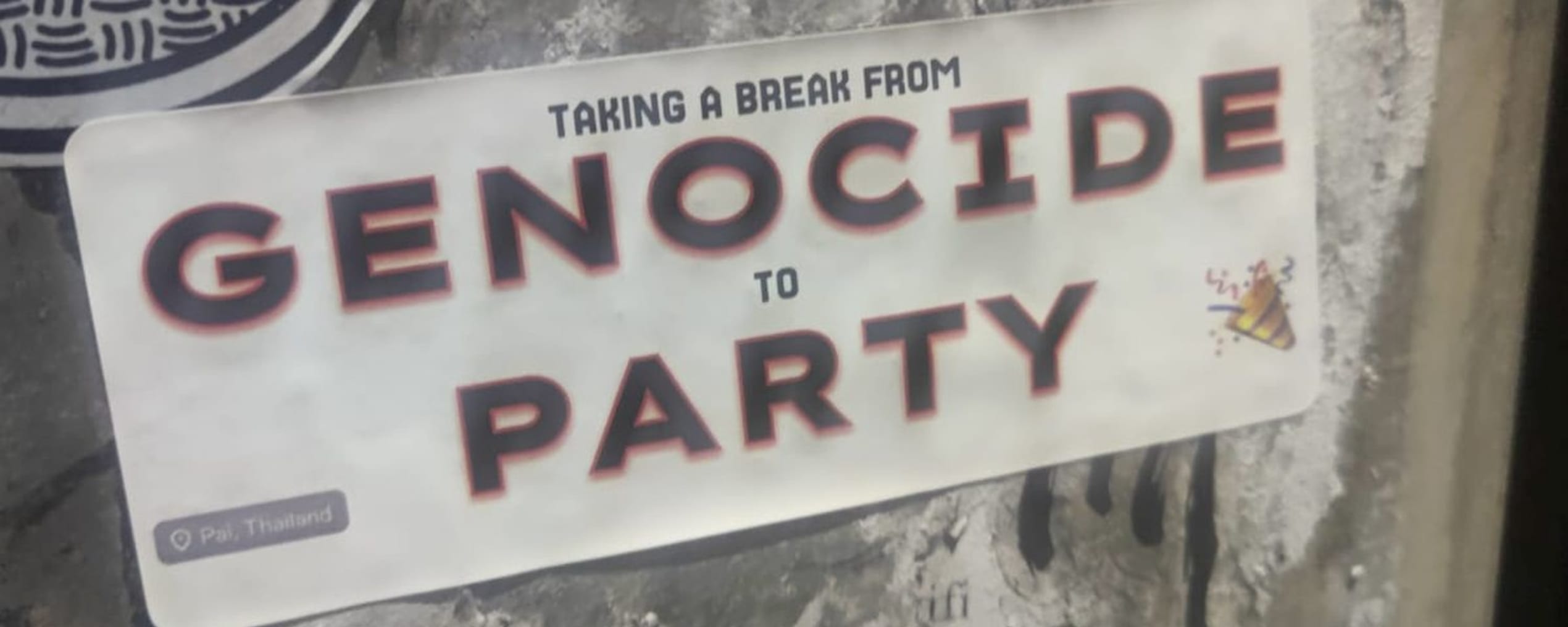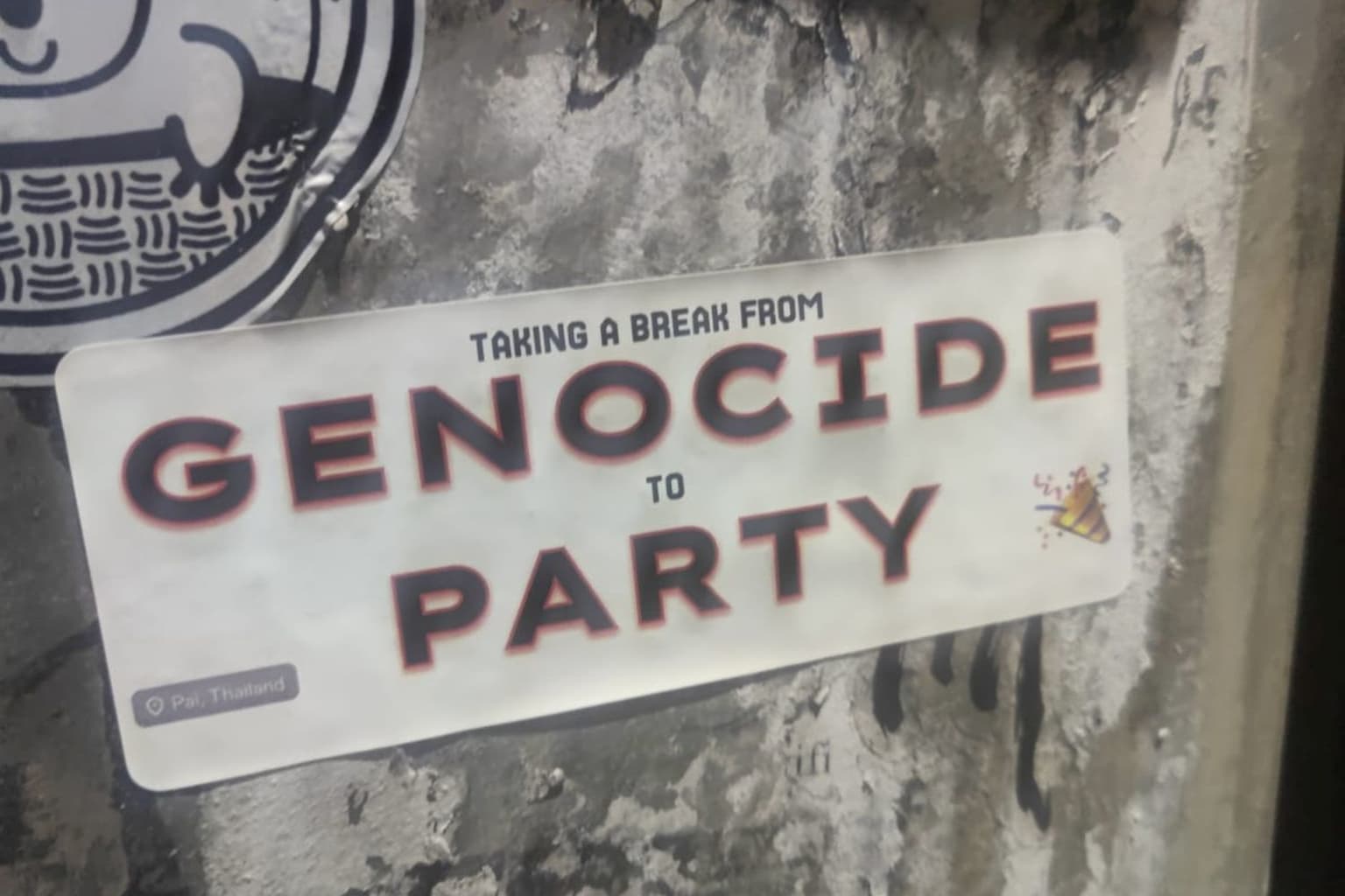 Elk jaar vertrekken duizenden jonge Israëli’s op ‘post-army trip’ en Pai is een populaire bestemming geworden om stoom af te blazen. Israëlische toeristen en stiekeme Palestijnse activisten lijken vreedzaam met of naast elkaar te leven. Al speelt zich op de wc-deur van mijn hostel wel een kribbelgevecht af. Wat me bij aankomst in Pai al meteen opviel, was het geluid van Hebreeuws op straat en de opvallende aanwezigheid van Israëlische stickers, vaak met een politiek kantje. ‘Taking a break from genocide to party’, lees ik op een sticker en ik kan alleen maar hopen dat die niet door een Israëli geplakt werd.