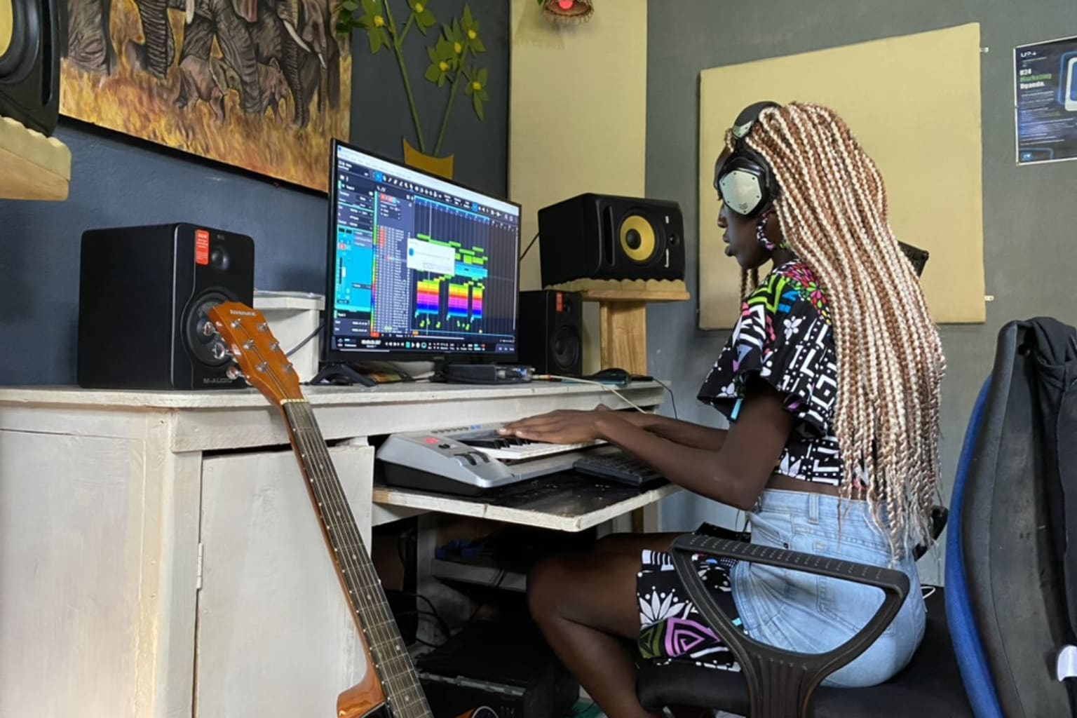 In de verte zie ik Timi al wandelen met haar gitaar in de hand. Ze heeft me uitgenodigd in de muziekstudio waar ze haar laatste nummer opnam. ‘Pegi paro’, zingt ze in het Acholi – haar stem vult de ruimte waardoor de eerdere woorden – ‘our eyes are on them’ – nu volledig uitdoven. Later legt ze uit wat het betekent: ‘het kan niemand iets schelen’. Ze vertelt me over dit lied. Het wringt met de eerdere uitspraak die de man me op het hart drukte. De toekomst is van hen, maar wie luistert naar haar?