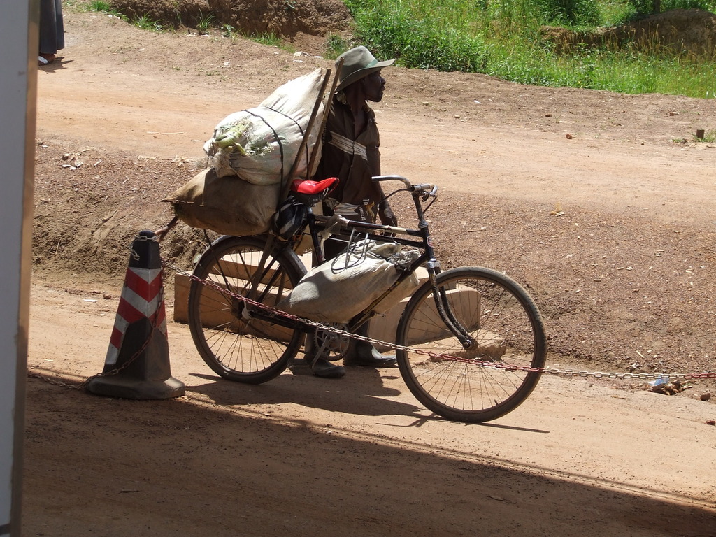 Deze keuze voor de fiets maakt dus wel dat we 10 fietsen nodig hebben. De kwaliteit van de fietsen die hier te koop zijn, is echter twijfelachtig. Alhoewel de lokale fiesters/transporteurs die we in grote getale zullen tegenkomen in het binnenland hier makkelijk tot 150 km per dag mee afleggen, met ladingen tot 200 kg (etenswaren, houtkool, vaten, stoelen, je kan het zo gek niet bedenken of men vervoert het wel met een fiets), durven we betwijfelen of onervaren muzungu’s op deze fietsen het traject ongeschonden kunnen afleggen :-)