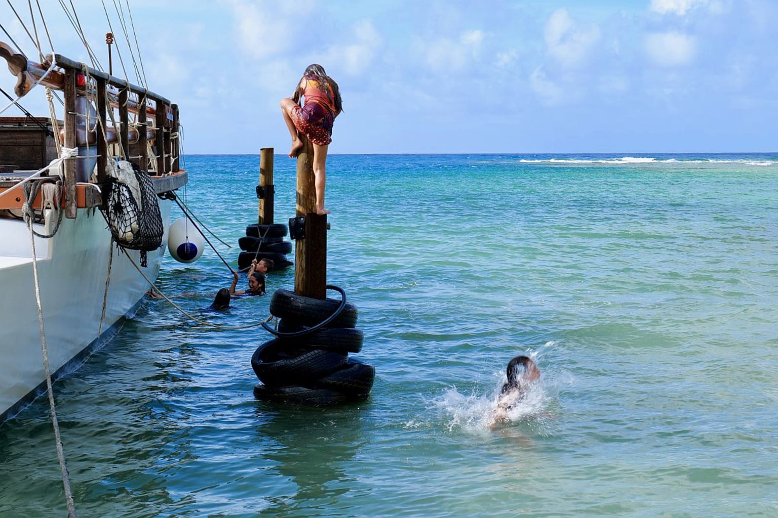 Haast twee maanden zijn we nu in de Cookeilanden, en veel eilanders zijn echte waterratten, die al van sinds ze jochies waren op visjacht gaan met de pistoolharpoen, die zich met het surfboard in de turkooizen golven wagen die uiteen spatten op het rif, die freediven in de diepe oceaan, die tussen de eilanden navigeren of in traditionele kano’s die dansen op de golven, om toch het handvol artisanale vissers niet te vergeten dat hier nog overblijft… Je denkt: iedereen is hier even goed op het land thuis als in zee.