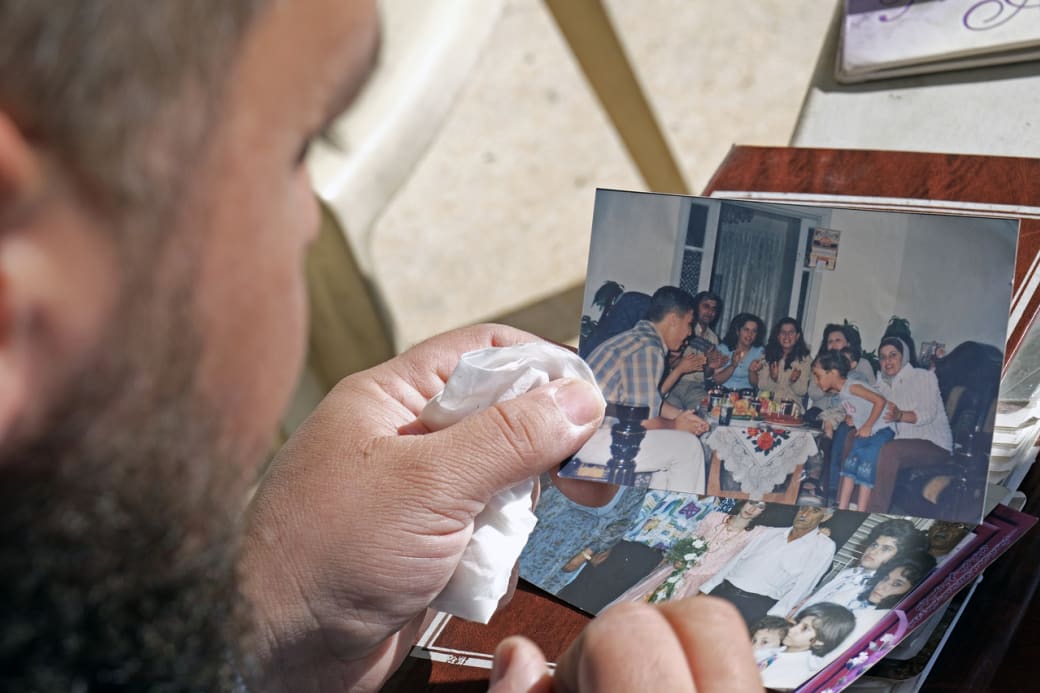“This picture is over 30 years old,” says Roni. “It’s from the late 1990s, Hafez was still president. All the people in this photo are now uprooted, scattered across Belgium and Germany. And here you can see my grandmother Fadila. She spent her whole life with my grandfather Wahid in the mountains among the olive trees, but she died and was buried in Stuttgart.”