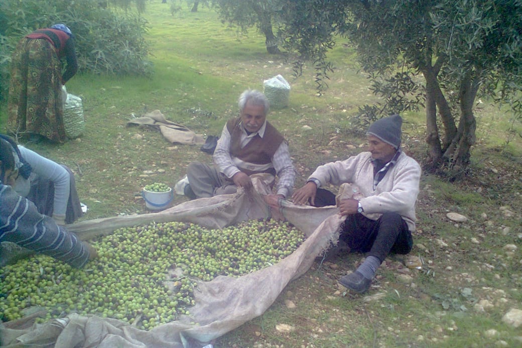In the mountains around Jinderes, Roni gestures to his uncle Mohammed to stop by his family's olive groves. Every autumn, they came here from Sheikh Maqsoud to harvest olives: burning bad branches, removing stones from under the trees, and picking olives.