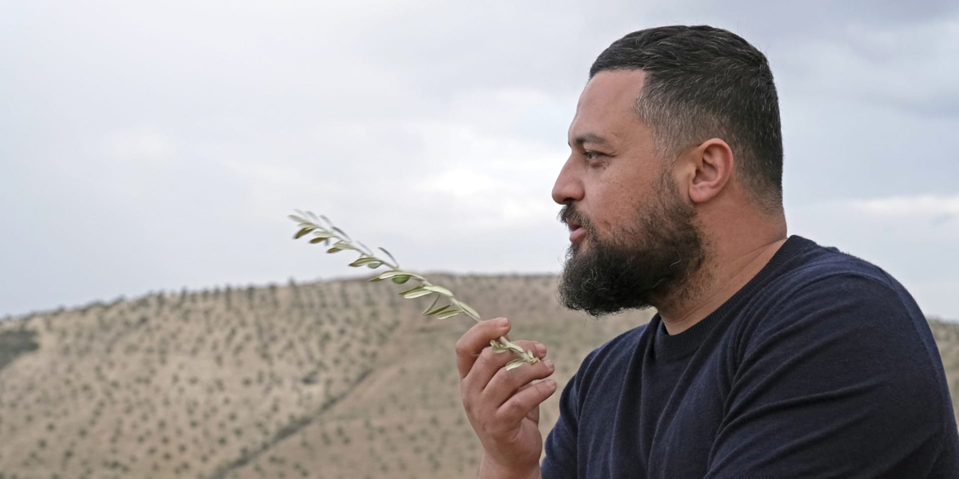 Holding an olive branch, he gazes over Mount Kurd, where the green dots reach to the horizon. Is he the dove of peace who takes the olive branch home, as proof that the war is over and the return to Kurdan is once again possible? That is his dream, but the reality is different, after the recent flare-up of violence.