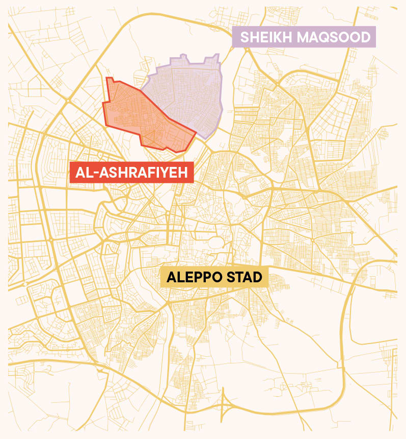Sheikh Maqsood is a maze of streets. Chaos reigns on the main road due to the Ramadan festival. Kurdish police zip past on mopeds. Among the half-destroyed apartment buildings – only the mosque has been repaired – there are market stalls and humming generators. On the outskirts of the neighbourhood, young people smoke water pipes, facing sandbags and walls of mistrust.
