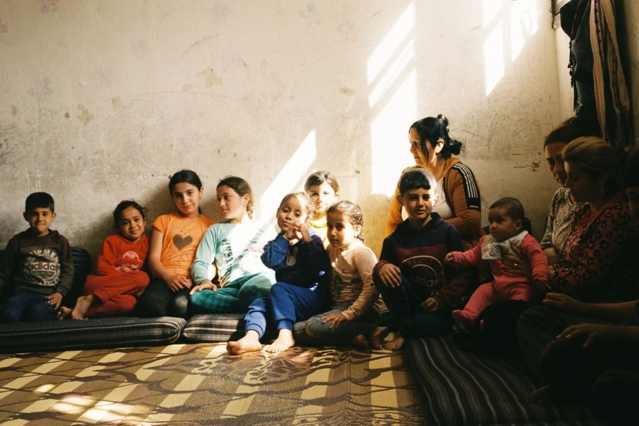 ‘We took tens of thousands of refugee students from Afrin into our schools’, says Roshin Yousef, headmistress of a school in Sheikh Maqsood. In the playground, refugee children take gymnastics lessons. Ages vary widely in the classrooms because many children have missed years of schooling due to displacement. Classrooms have been converted into dormitories, with mattresses instead of desks, and kitchens.