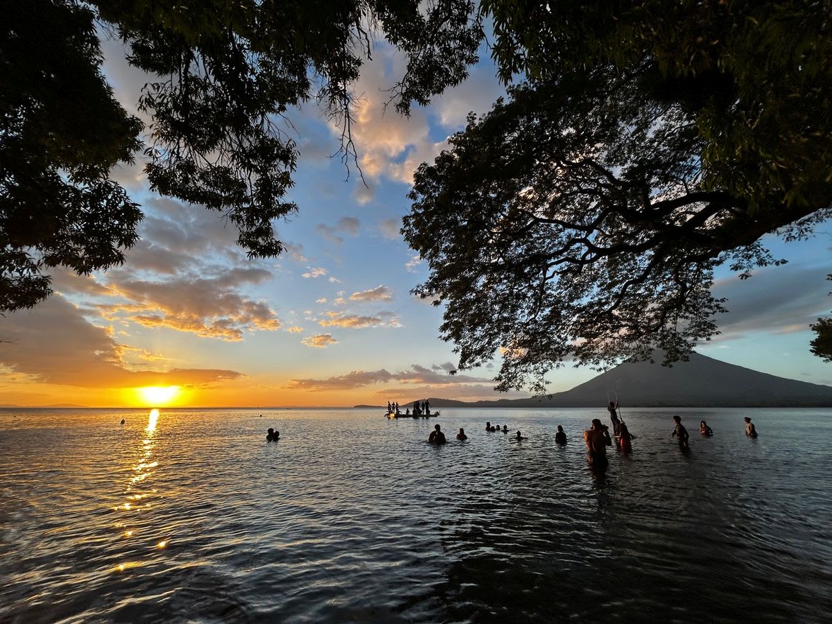 Kanoënd bij ondergaande zon in de baai van Playa Mangos zegt Vera: ‘Ik heb nog nooit zo’n mooie plek gezien.’ Ik ook niet. Een verslaggeefster van de BBC die in 2022 dezelfde kanotocht maakte, had onder inwoners van Ometepe een hoopvolle stemming opgetekend. Zo voorspelde de eigenaar van haar pension de komst van een nieuwe stroom toeristen zodra er olietankers en containerschepen in optocht langs het vulkaaneiland zouden varen. Scheepsspotters, zoals er ook in Panama op de heuvels aan weerszijden van de sluizen neerstrijken.