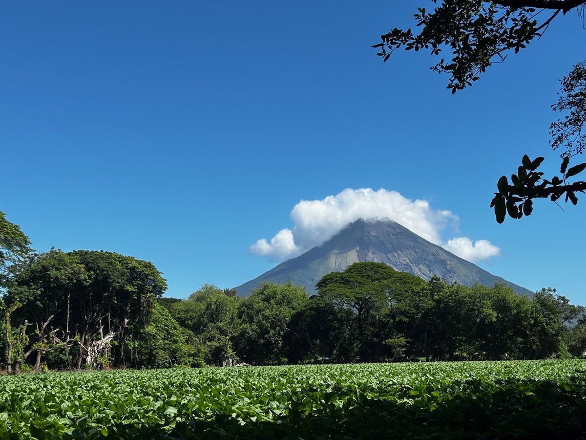 De schouderhoge bronzen Sandino bij de aanlegsteiger van Ometepe valt nauwelijks op tussen de verhuurbedrijfjes van scooters en mountainbikes. We lopen naar ons hotel op de heuvel, waar de eigenaren Jorge en Elena ons scooterrijles geven op een honkbalveld. Spontaan vertelt Jorge over de crisis van 2018, toen Nicaragua rood kleurde op de reisadvieskaartjes. De toeristen bleven weg. Om te kunnen eten waren de inwoners van Ometepe, zo’n dertigduizend in getal, weer gaan schoffelen in hun moestuinen. Bloemperken werden yuccaveldjes. ‘Onze grootouders waren campesinos,’ zegt Jorge, ‘onze ouders zijn dit hotel begonnen, en wij werden ineens weer campesinos.’