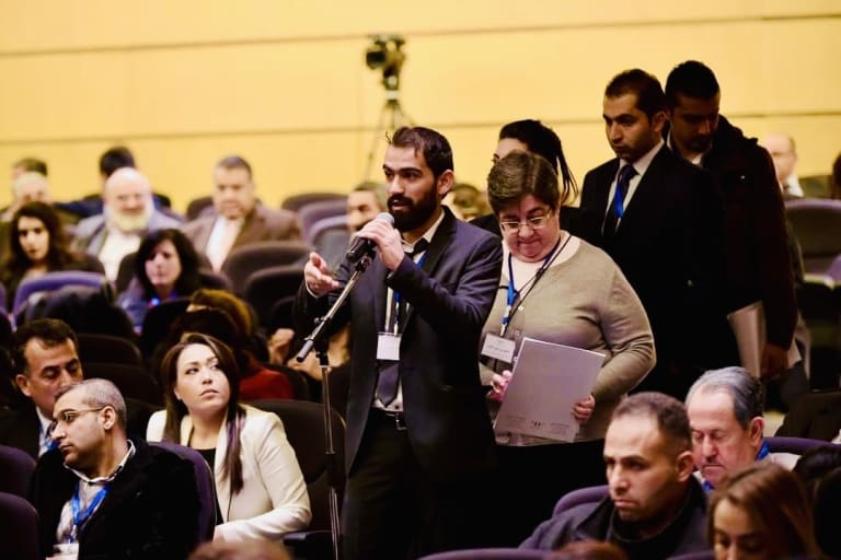 Ahmad al-Ahmad stelt een vraag tijdens een conferentie van de Syrische regering in 2019. Rechts van hem zit Salam Safaf, destijds een minister in de regering. Links zit Fawaz al-Akhras, de vader van Bashar al-Assads vrouw Asma.