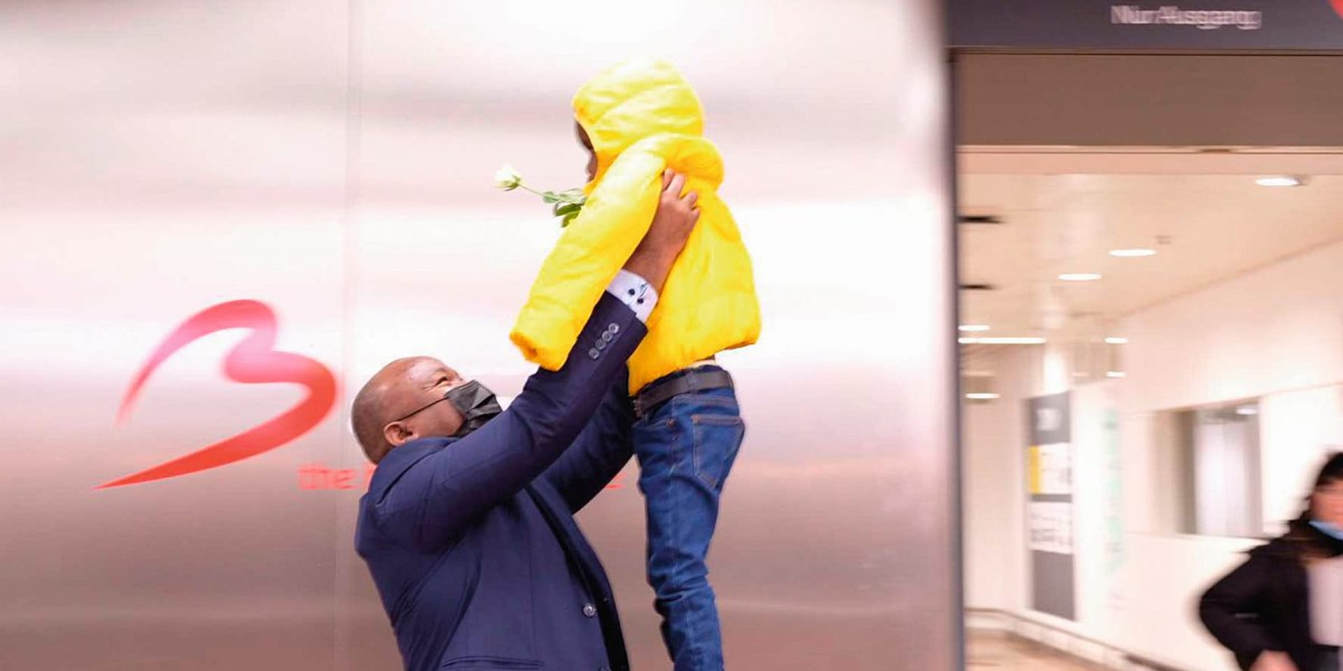 Zijn vrouw probeert de kleine Mugisha te roepen. Die is geschrokken van het uitgebreide onthaalcomité en verstopt zich achter de openstaande deur die de aankomende reizigers scheidt van de wachtenden in de aankomsthal. Vader Rukuki breekt het ijs en stapt op moeder en zoon af. Hij geeft zijn vrouw een innige knuffel en richt zich dan snel op de kleine jongen, die zich verstopt voor de vreemde man die zijn vader is. Rukuki pakt de jongen op en gooit hem in de lucht (foto bovenaan dit artikel, red.). Hij is een vrij man.