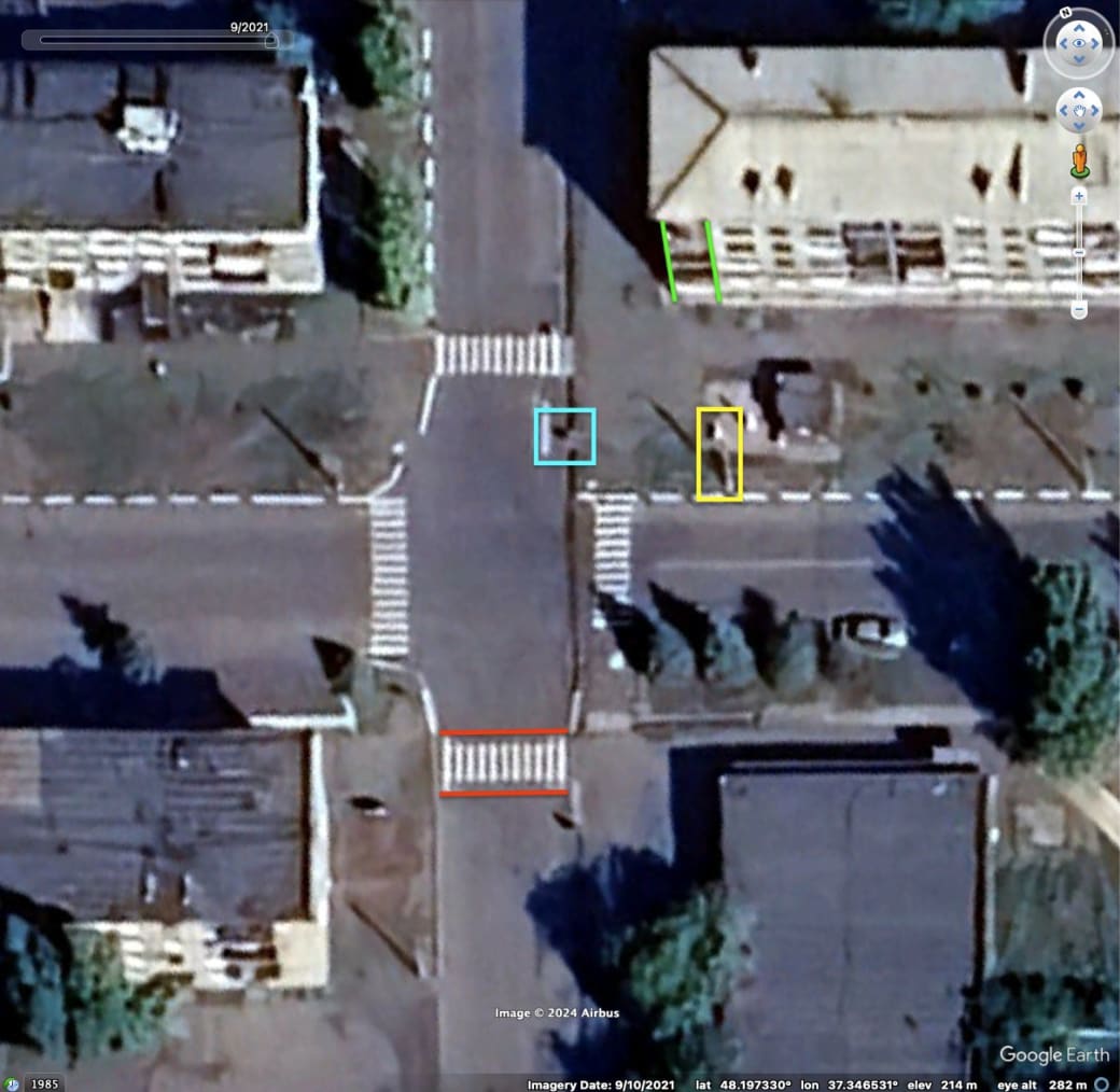 Geolocatie van een vermoorde Oekraïense krijgsgevangene met een zwaard dat uit zijn borst steekt en de inkerving За Курск (voor Kursk). De locatie is Novohrodivka, 40 km ten noordwesten van Donetsk. © Benjamin Strick