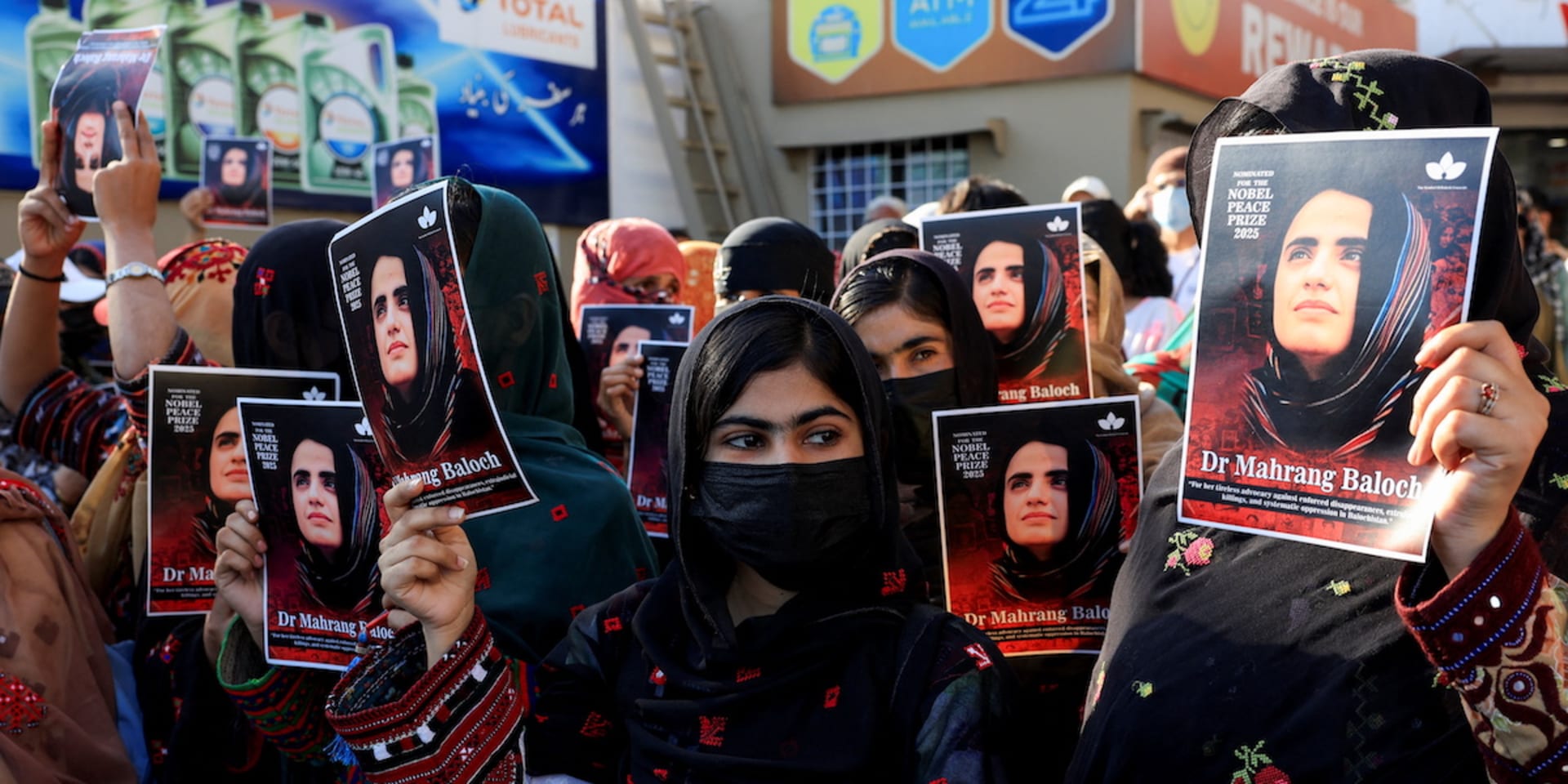 Vrouwen die het Balochistan Yakjehti Comité (BYC) steunen, eisen de vrijlating van protestleidster Mahrang Baloch.