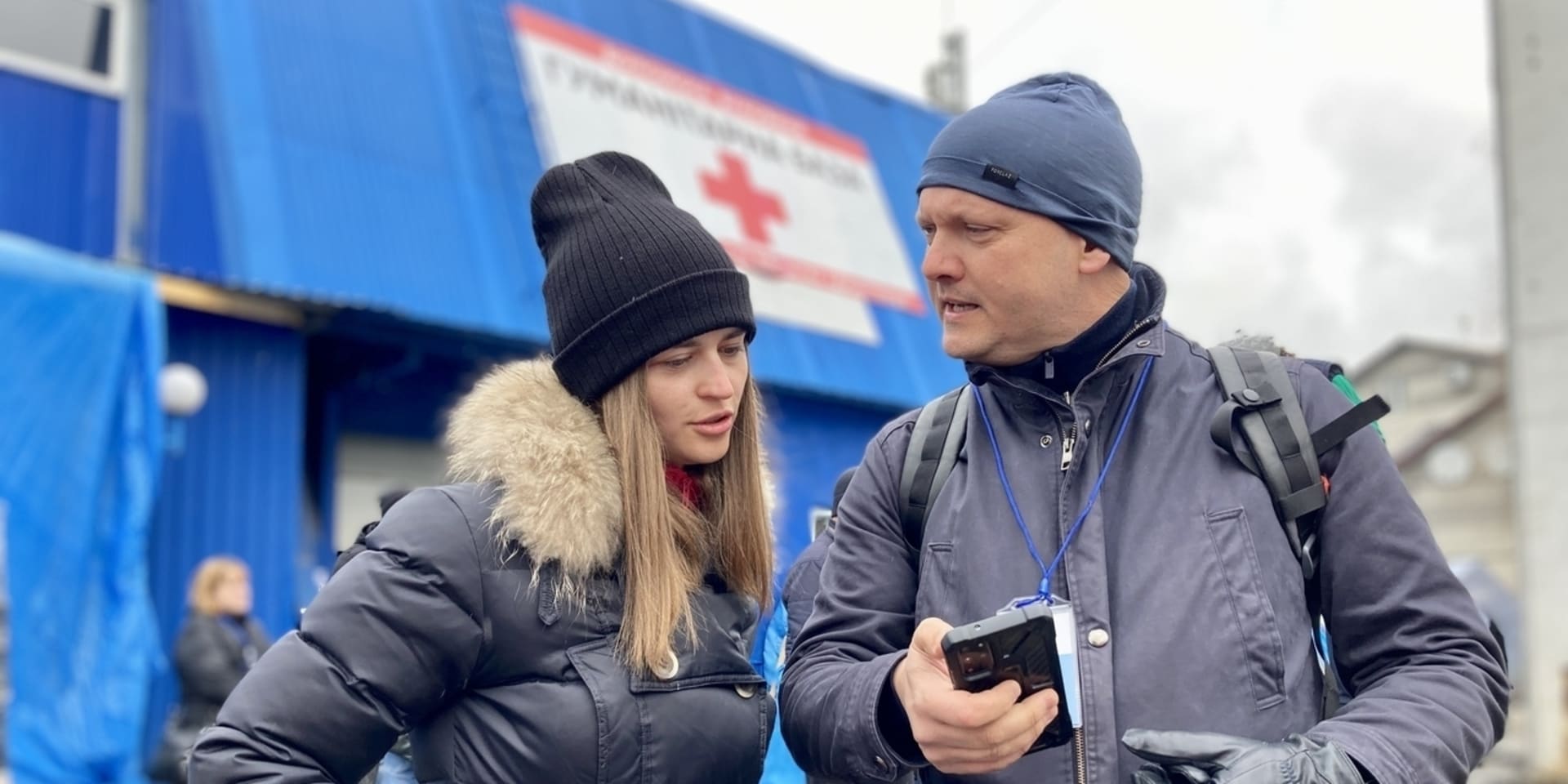Kai Brand-Jacobsen met Anastasia Magerramova, perswoordvoerder van een kinderziekenhuis in de Oekraïense hoofdstad Kiev. © Pieter Stockmans