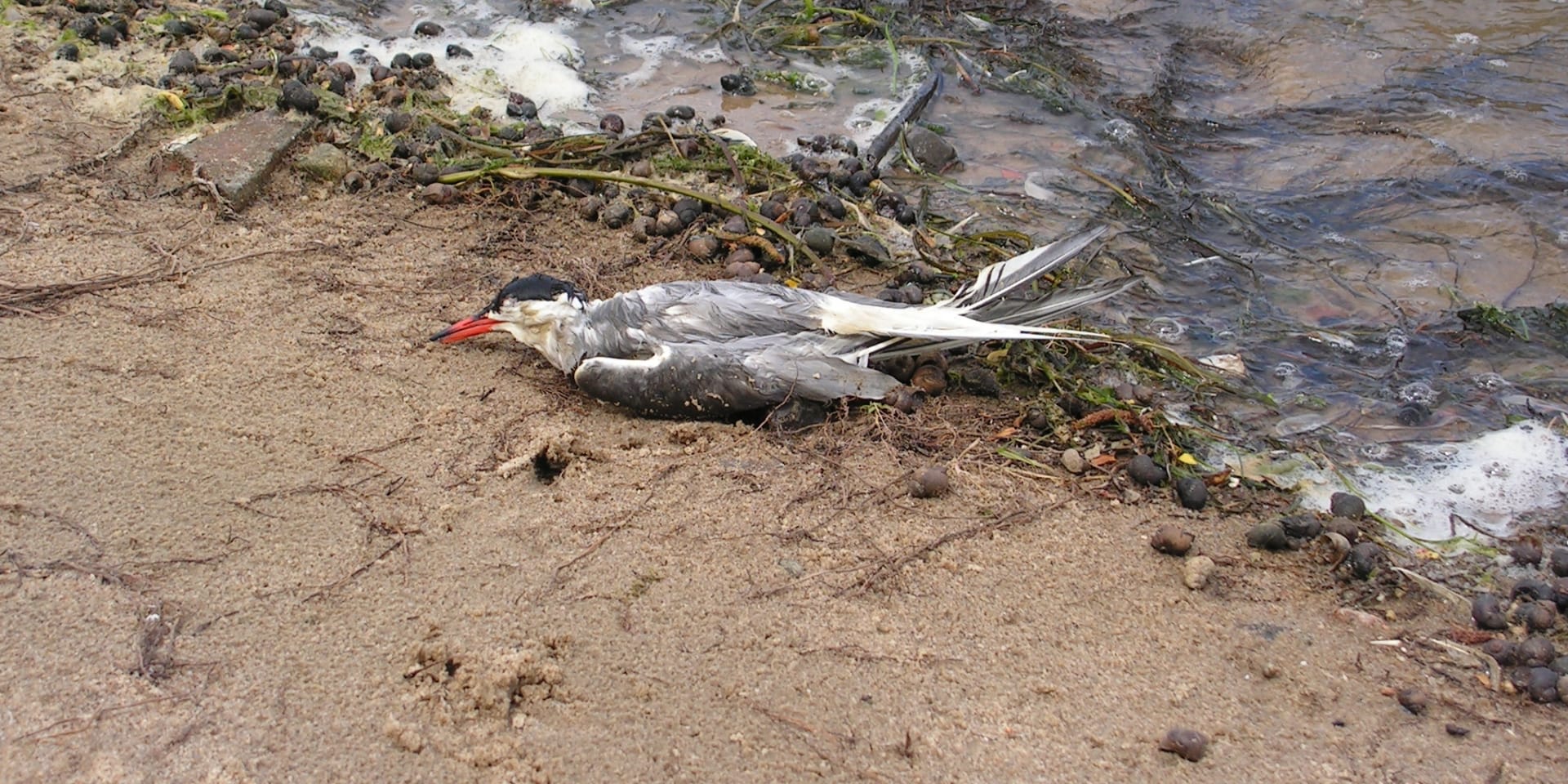Het kadaver van een vogel in de Wisla, een rivier in Włocławek, Polen, gedood met een elektriciteitskabel door stropers.