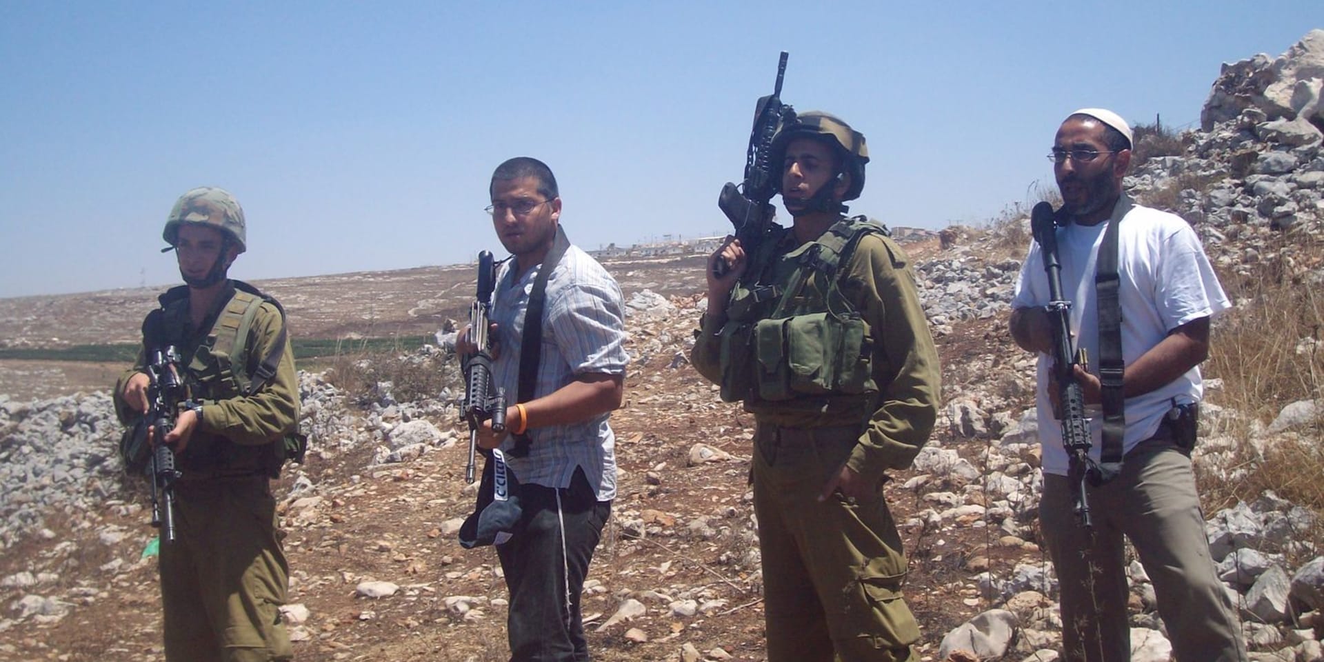 Joodse kolonisten en soldaten van het Israëlische leger poseren voor de camera. Gezamenlijk vielen ze in het Palestijnse dorp Iraq Burin demonstranten aan die op straat kwamen tegen etnische zuivering. (beeld uit 2009!)