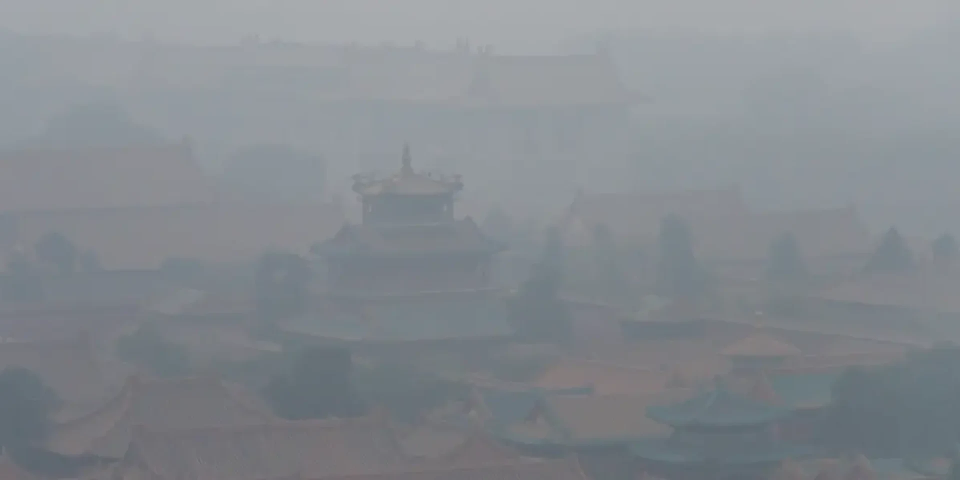 Een klassiek beeld van de Verboden stad in China, gehuld in smog. Maar er is beterschap op komst; de CO2-uitstoot van China is nu al 18 maanden gelijk of dalend, te beginnen vanaf maart 2024.