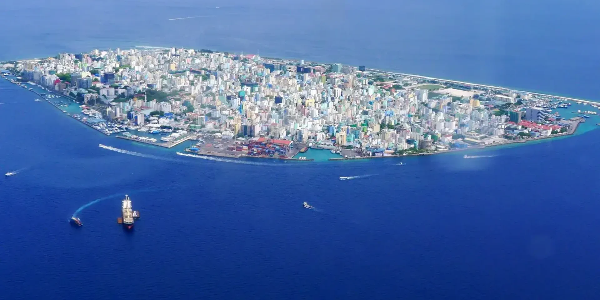 Luchtbeeld van Malé de hoofdstad van de Malediven. Wetenschappers voorspellen dat veel van de eilanden tegen 2100 onbewoonbaar kunnen worden.
