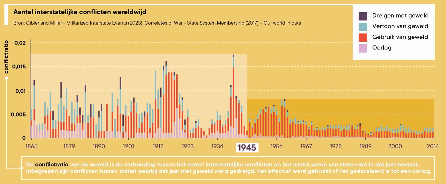 Wellicht de belangrijkste regel is artikel 2.4 van het Handvest van de Verenigde Naties dat staten ertoe verbindt geen geweld te gebruiken tegenover elkaars grondgebied en daar ook niet mee te dreigen. Die kwam er na de Tweede Wereldoorlog, de grootste slachting uit de menselijke geschiedenis, waarbij naar schatting meer dan 60 miljoen doden vielen. De regel is werd zeker niet altijd gerespecteerd, maar hij werkt wel ontradend. In de tachtig jaar voor 1945 waren er meer interstatelijke conflicten dan in de tachtig jaar erna (zie grafiek).