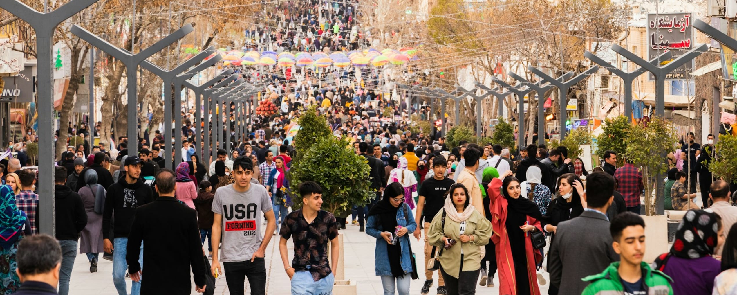 Een drukke winkelstraat in Iran.