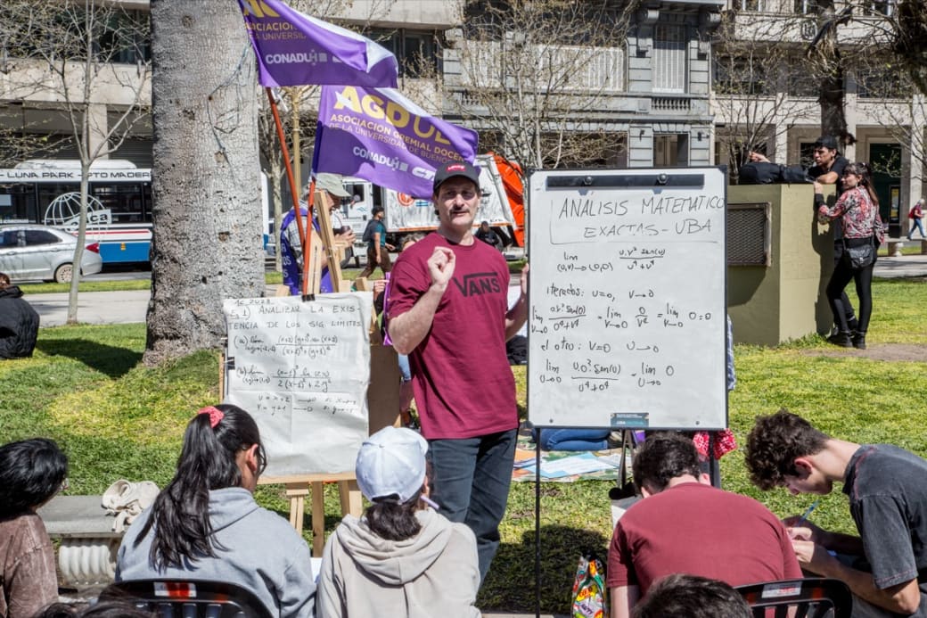 ‘Het functioneren van de universiteiten staat op het spel’, zegt professor Carboni. De straten rond het Plaza del Congreso zien zwart van het volk. Leerkrachten geven symbolisch buiten les in de zon, om aandacht te vragen voor hun zaak.