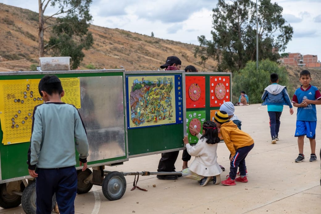Dinsdagmiddag in Lajastambo, een buitenwijk van Sucre. Leraar Rodrigo Lora rijdt luid toeterend met zijn Mobiele Schooltje het voetbalveldje van de wijk op, waarna hij en vier Europese vrijwilligers een aanhanger met een meterslang schoolbord vol didactische spellen uitklappen. Binnen vijf minuten hebben veertig kinderen zich verzameld. ‘Hola profe!’, roepen ze enthousiast, en ze storten zich op de spellen.