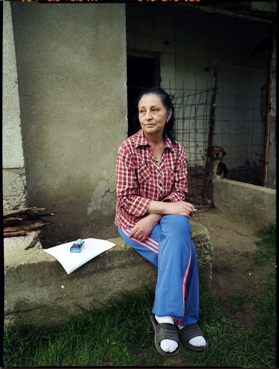 Ze poseert in de koele voorkamer. Boven haar hangen foto’s van haar man en haar zoon. Ze werden in 1995 opgepakt en weggevoerd door de Servische milities. Het skelet van haar man werd volledig teruggevonden in twee massagraven. Van haar zoon werden slechts twee beenderen geïdentificeerd.
