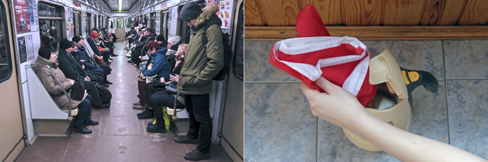 Links: De collectieve natie wordt opgesplitst in losse atomen door een diepe angst te installeren. Rechts: Eva nam deel aan de protesten tegen Loekasjenko. Vier jaar later blijft enkel haar wit-rood-witte vlag van het democratische Belarus over. Die heeft ze verborgen in een theepot, een soort urne waarin ze haar hoop heeft begraven.