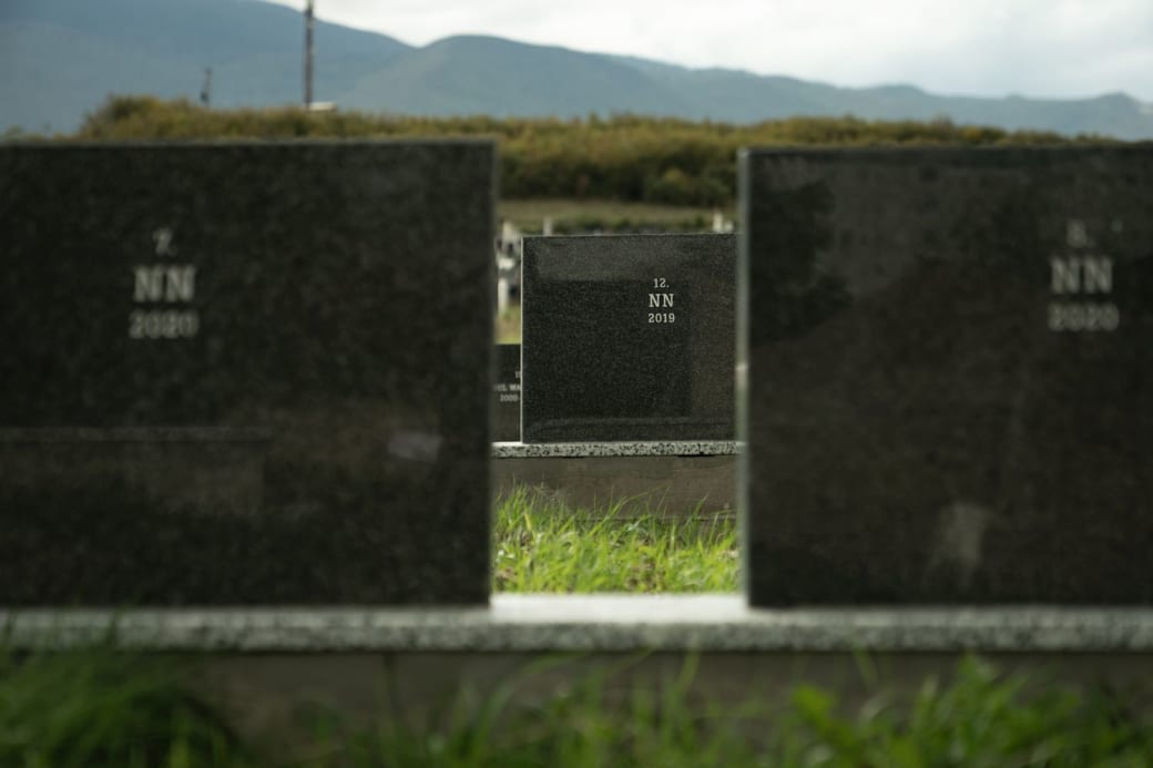De houten grafmarkeringen werden een paar maanden geleden vervangen door massieve granieten grafstenen, op initiatief van Suljić en SOS Balkanroute. Ze staan in sober contrast met de weelderig versierde graven op de achtergrond. Hier liggen geen bloemen, linten of foto's van de overledenen naast de stenen. Niets getuigt van het verlies van de nabestaanden. Alle grafstenen zijn gegraveerd met twee vette letters: ‘N.N.’ Dat staat voor ‘No Name’. Dit zijn de anonieme doden van de Balkanroute, waarvan de nabestaanden het lot van hun dierbaren misschien nooit zullen kennen.