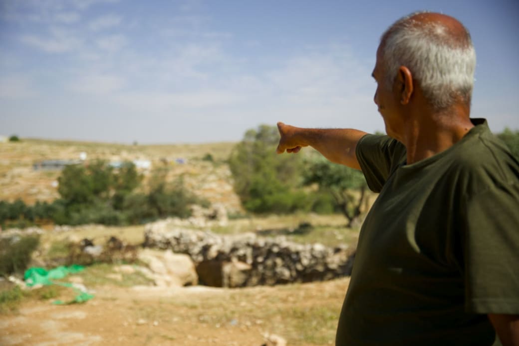 Een inwoner van Susiya wijst naar twee nieuwe Israëlische voorposten op de heuveltoppen die het dorp omringen.