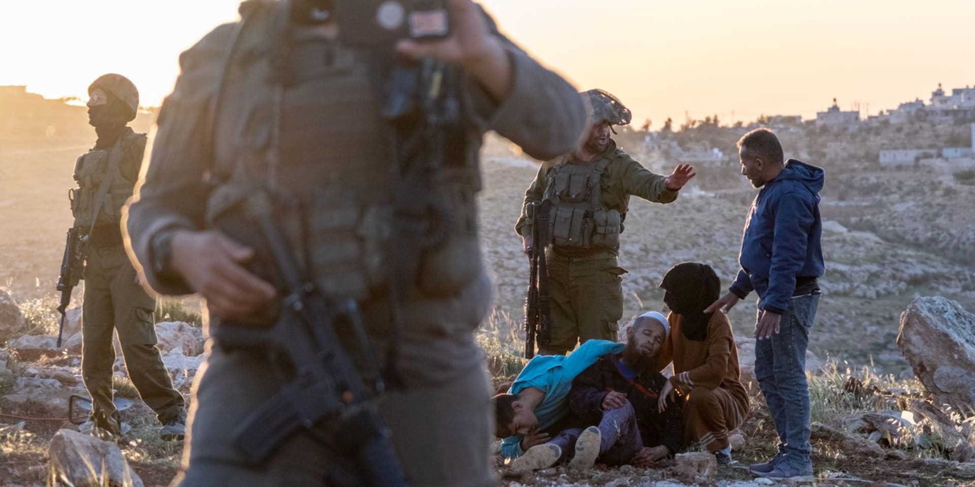 Soldaten confronteren de lokale Palestijnen na de schietpartij en jagen hen weg.