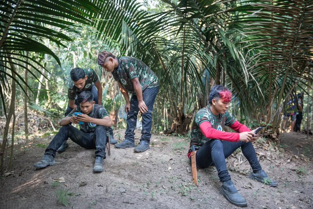 We trekken het bos in met Lúcia Munduruku (23), leidster van Guardiões do Território (hoeders van het territorium), een jonge patrouillegroep die een lappendeken van bossen en rivierarmen beschermt. Ze is zowel guerreira (vrouwelijke strijder) als spirituele hoeder. Het gebied dat haar team bewaakt – ruim anderhalf keer de omvang van Brussel – omvat veel van de paden waar Nato zijn eerste rituelen en visioenen meemaakte.