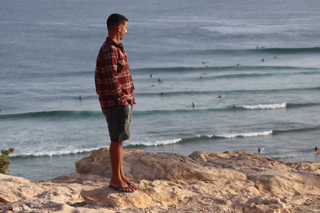 Vanop een heuvel met zicht op het dorp en zijn ‘magische’ baai kijkt Mohamed naar zongebruinde Marokkaanse jongens die moeiteloos naar de line-up peddelen, de plek waar de golven breken. Als er een golf aankomt, springen ze op hun plank en glijden honderden meters over het glinsterende water. Ondertussen banen Europese toeristen zich, onder aanmoediging van een surfinstructeur, een weg door het witte schuim.