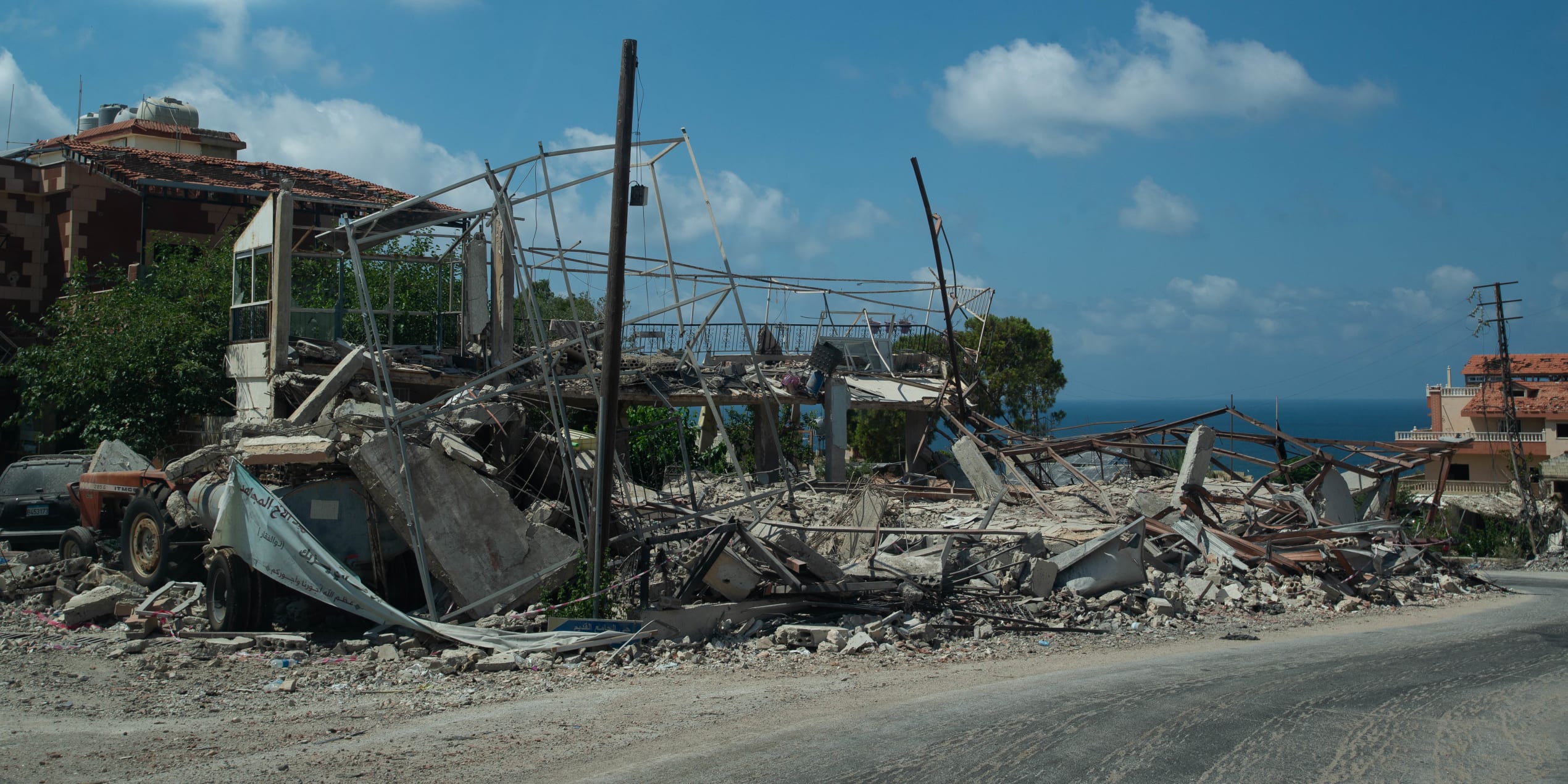 In Naqoura, op twee kilometer van de grens met Israël, zijn alle rolluiken naar beneden gelaten. Het dorp is uitgestorven. De apotheek, de supermarkt, de bakkerij, allemaal zijn ze gesloten. Een groot deel van de huizen, maar ook het lokale restaurant, ligt in puin. Alleen enkele kapotte bezittingen zoals een blauwe gasfles, of een roze T-shirt, verraden dat er tot voor kort mensen woonden in deze huizen.